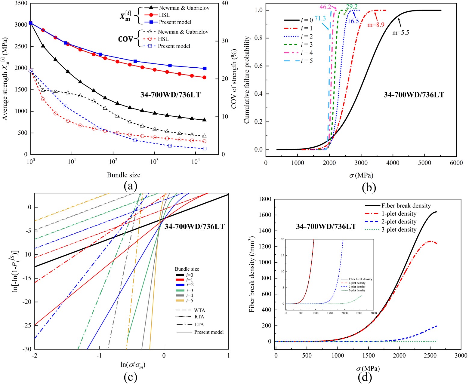 基于提出的模型,对34-700WD/736LT和T700SC/SR8500两种复合材料的拉伸强度进行了预测。预测结果显示,各尺寸纤维束的强度分布同样满足Weibull分布特征。随着尺寸的增大,其平均拉伸强度和强度分布的离散性也呈现下降趋势。模型的预测结果与已有的相关研究成果相符,验证了尺度效应的存在。