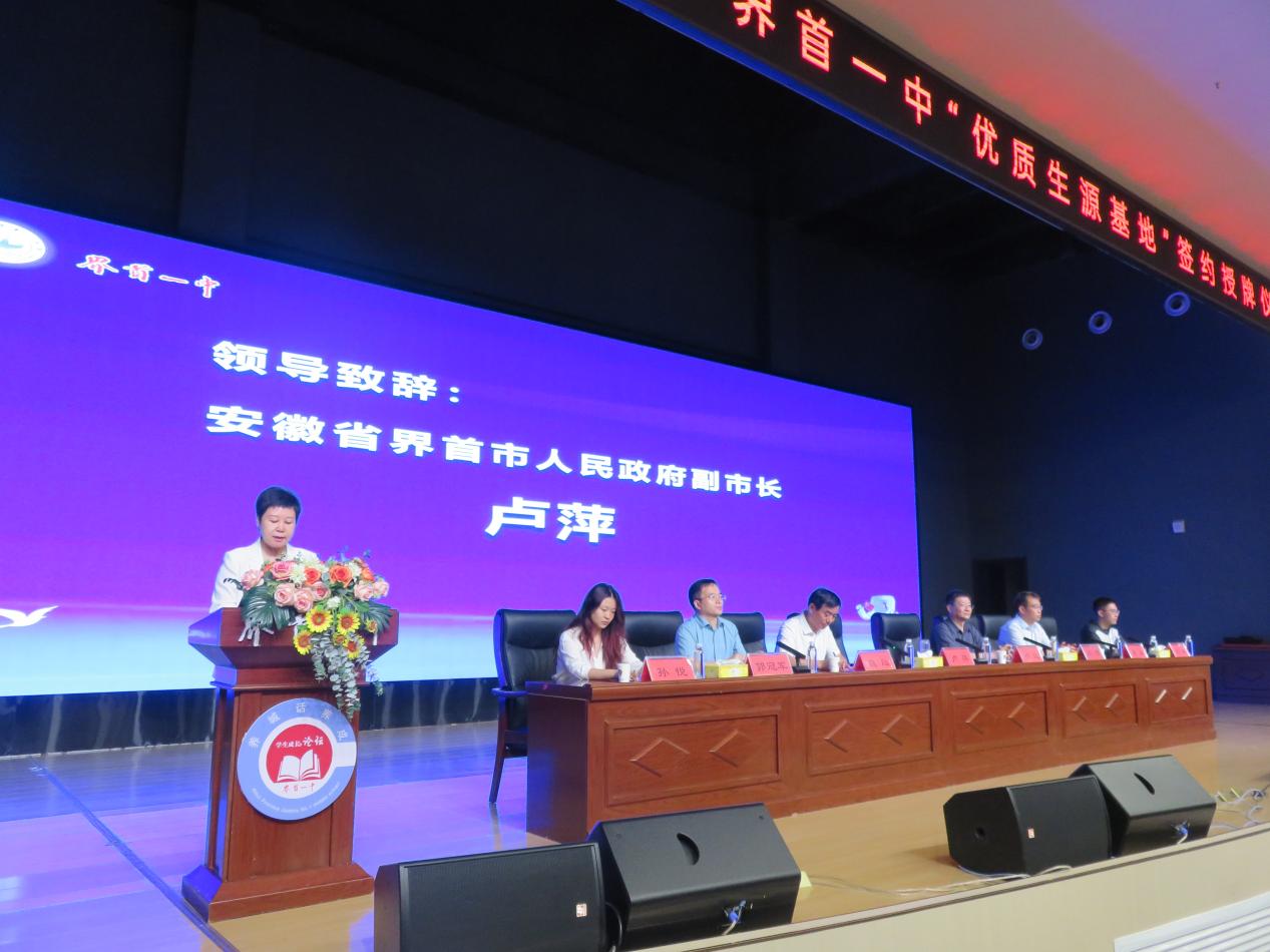 仪式第二阶段在界首一中养城校区会议中心举行,仪式由界首市教育局局长魏灿主持。魏灿局长首先介绍了主席台嘉宾,随后闫锋校长发表了热情洋溢的致辞。他表示,北航授予界首一中“优质生源基地”,体现了北航对界首一中办学思想和办学质量的充分肯定、高度重视和信任。他希望以此次授牌仪式为契机,不断强化彼此间的合作交流,把两校办学合作推上一个新高度。