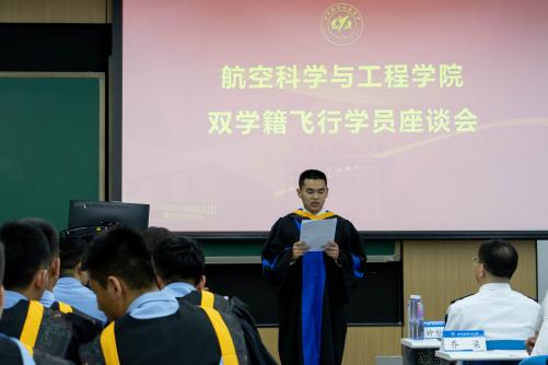 座谈会上,“双学籍”飞行学员代表吴志强、于浩先后发言,表达了对学校、学院的感恩之情,并分享了各自在北航的成长经历,汇报了2020级“双学籍”飞行学员的发展情况,同时向学员队的师弟们表达了祝愿,激励其成长成材。