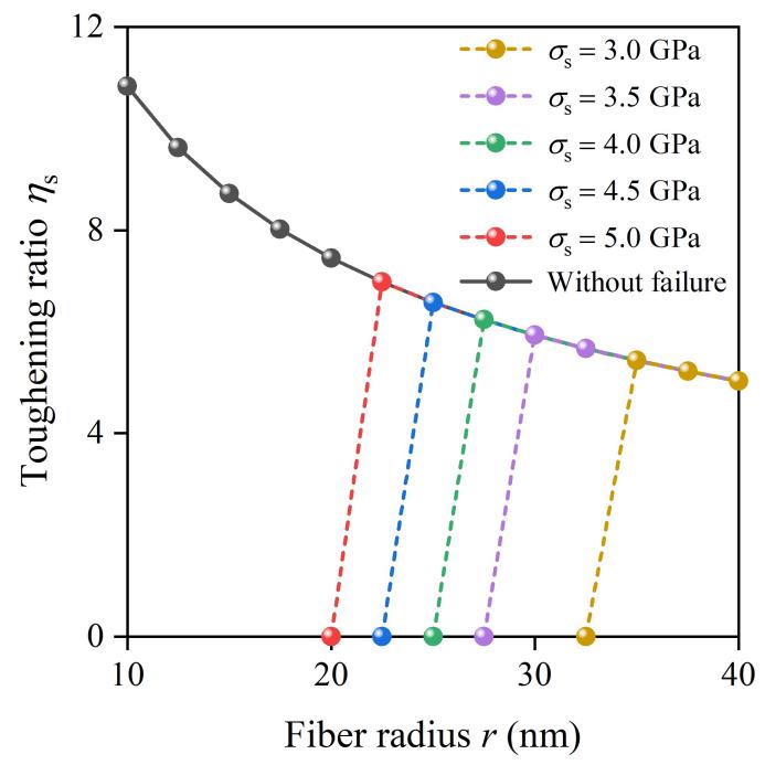 图5 不同材料强度下纤维半径对增韧比的影响。