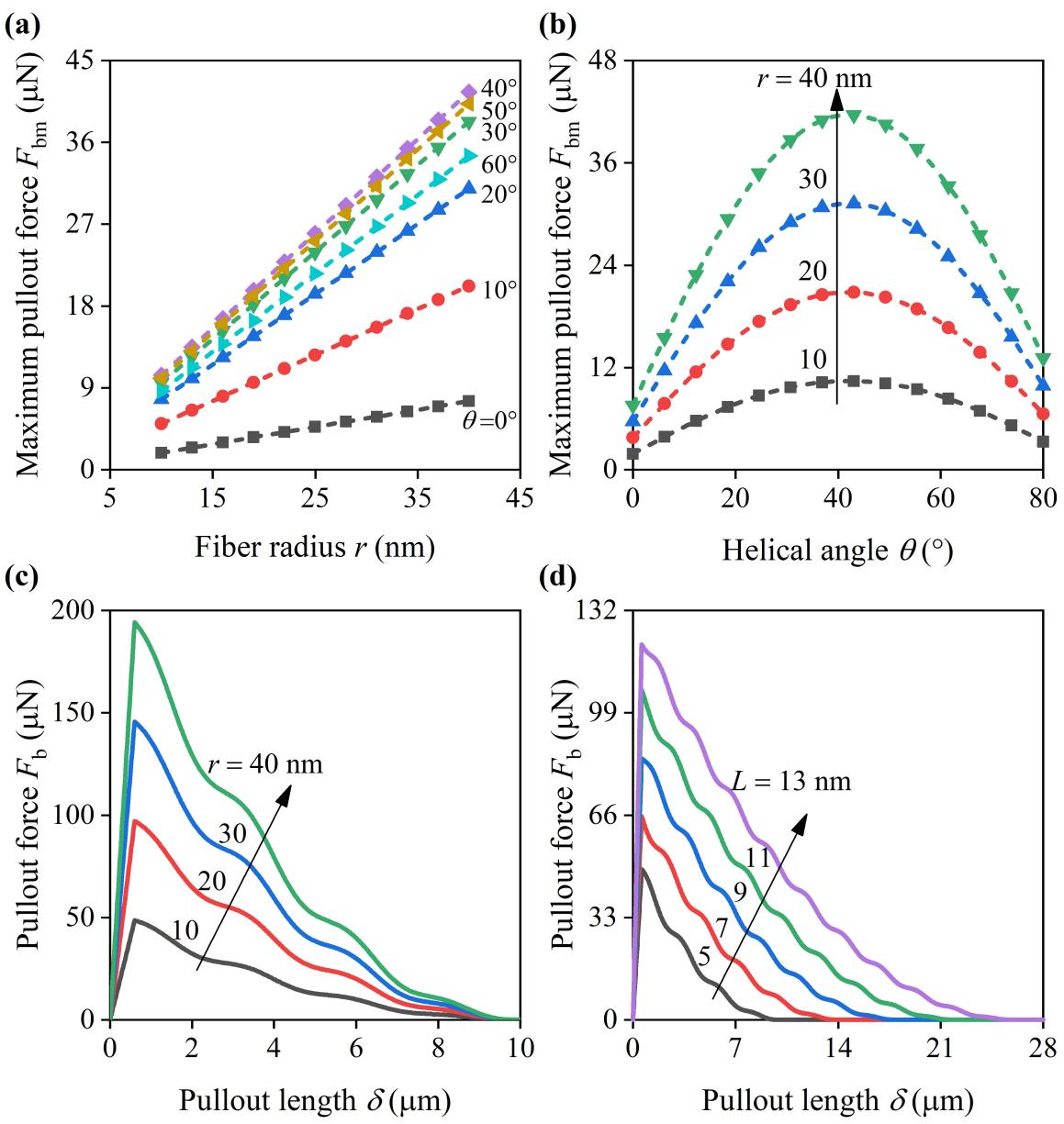图4 纤维几何对其力学响应的影响规律。(a)纤维半径和(b)螺旋角对最大拔出力的影响。(c)纤维半径和(d)纤维长度对拔出力的影响。