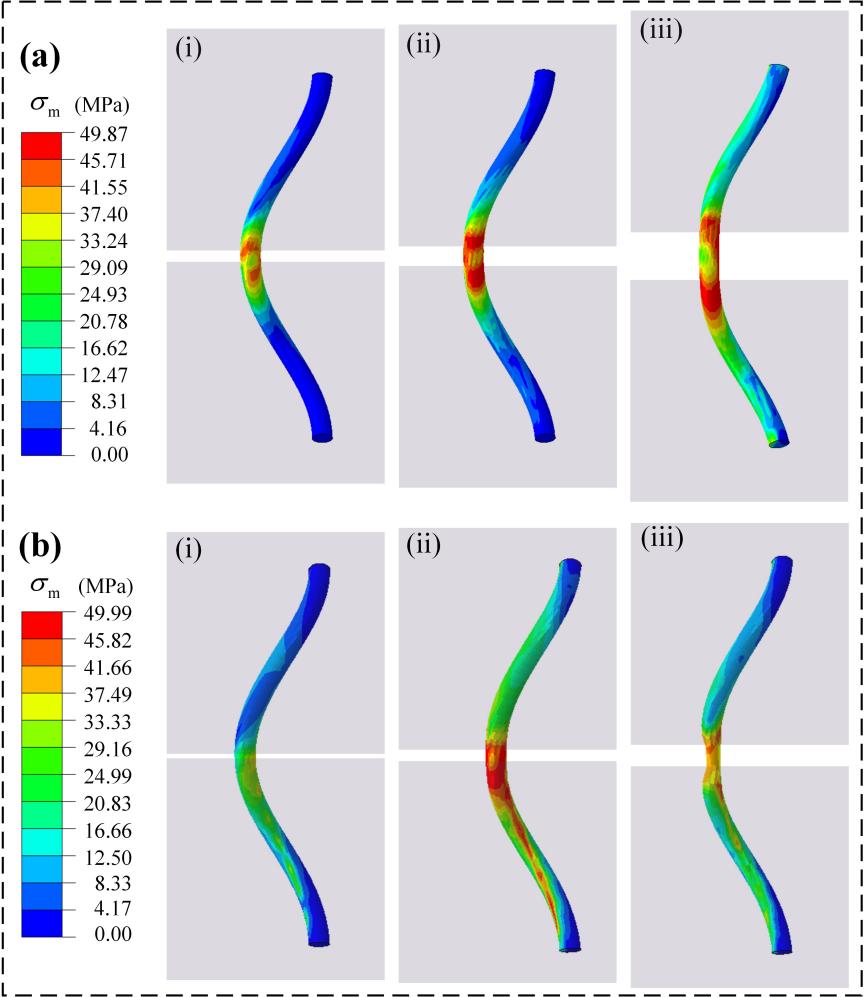图3 从左到右,纤维被逐渐拔出。纤维的应力分布。(a)纤维在被拔出的过程中未发生断裂。(b)纤维在被拔出时发生断裂。