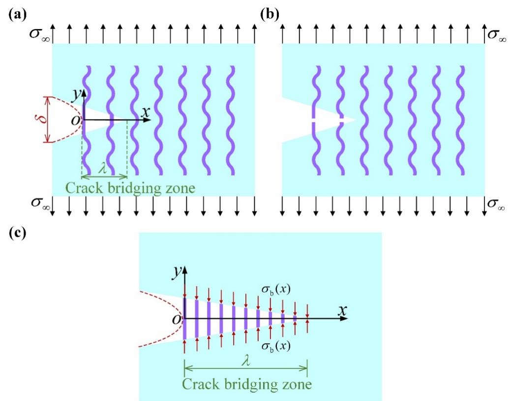 图2 含螺旋纤维的复合结构的断裂力学模型。(a)多根纤维桥联上下裂纹面。(b)桥联纤维被拉断。(c)桥联应力的分布示意。