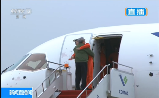 图2 C919着陆后,总设计师吴光辉与试飞员蔡骏紧紧相拥