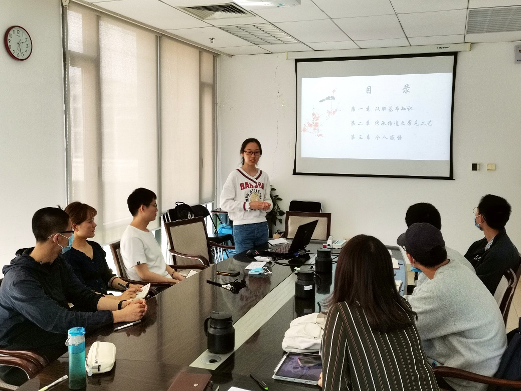 第三项内容,支部党员进行“汉服与传统文化”专题分享。赵明潇同志以丰富的图片和视频对汉服的基本知识及汉服在各个朝代的不同形制进行了科普,之后介绍了一些汉服的制衣工艺和相关配饰,如缠花、绒花,刺绣、云锦、缂丝等等。支部党员们对此很感兴趣,在聆听的过程中体会到了汉服文化的博大精深。