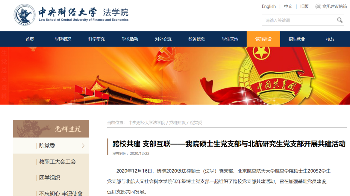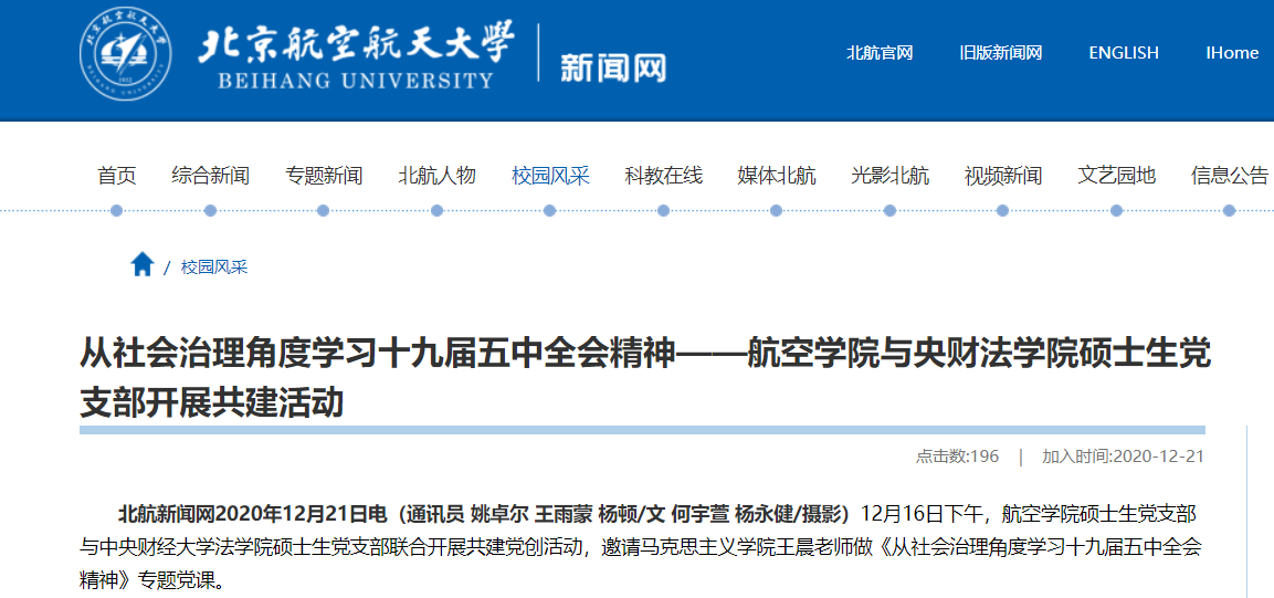 2020年12月至2021年5月,北航航空学院硕士生20052学生党支部和央财法学院2020级硕士党支部支委共同规划,支部党员积极参与,圆满完成了“携手聚焦十四五,共话远景新目标”党创活动。