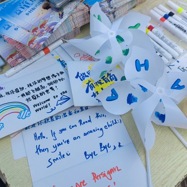 活动现场,同学们参与热情高涨,通过文字与手绘向山区儿童描绘了丰富多彩的北航学习生活,鼓励他们好好学习,成长成材,树立远大目标,致力于家乡建设,并送上节日祝福。