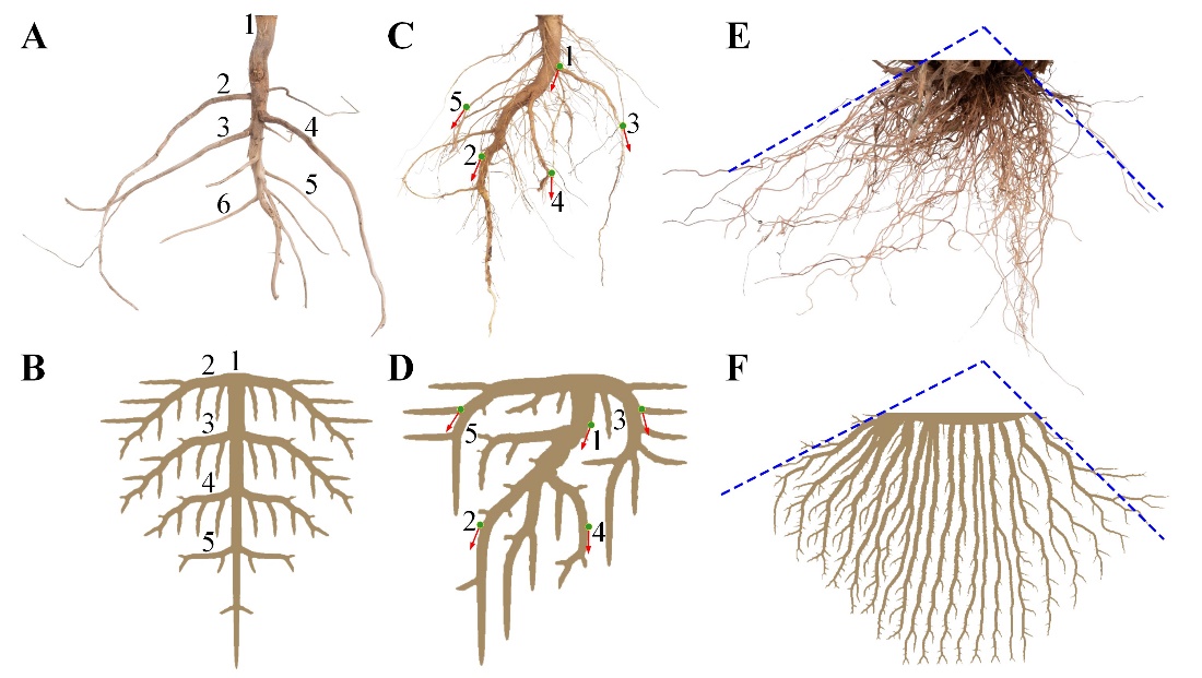 如图1所示,根尖一般由根冠、分生区、伸长区和成熟区等四个部分组成。根冠能感受重力的梯度。分生区的细胞在分裂后朝着根冠的方向被拉长。成熟区的分化过程受根的粗细、含水量、荷尔蒙含量以及基因等因素影响。如图2所示,这项工作主要考察了直根和须根两种根系。直根系由一个主根和许多侧根组成;主根长且粗,有很强的向地性;侧根较短,相互分离。须根系没有明显的主根;大量的不定根从茎等非根组织萌发、生长,它们的长度、粗细大体相同。