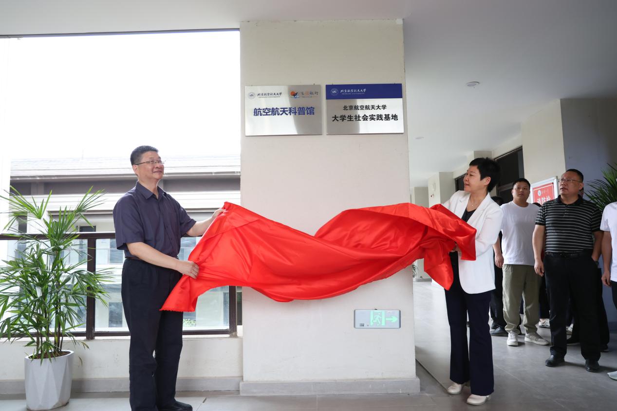 图为杨超教授和卢萍副市长共同为航空航天科普馆和北京亚洲成人在线一二三四五六区大学生社会实践基地揭牌