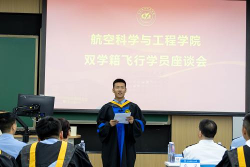 座谈会上,“双学籍”飞行学员代表吴志强、于浩先后发言,表达了对学校、学院的感恩之情,并分享了各自在北航的成长经历,汇报了2020级“双学籍”飞行学员的发展情况,同时向学员队的师弟们表达了祝愿,激励其成长成材。