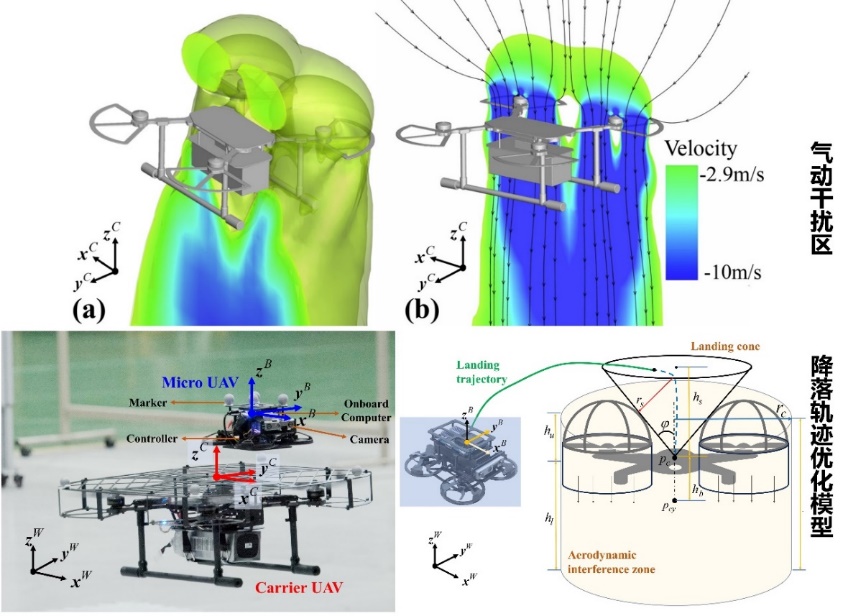 子母式无人机系统由大型无人母机携带微小型子机构成,可以极大程度地扩展灾情快速获取系统的应用区域。子机在回收过程中会受到母机螺旋桨气流的干扰,极大影响其降落精度和回收成功率,为了克服这个难点,实现子母式无人机精准回收,团队发表了题为 “Aerial Landing of Micro UAVs on Moving Platforms Considering Aerodynamic Interference(考虑气动干扰的微型无人机空中移动平台自主降落方法)” 的论文,介绍了他们研发的无人机空中平台自主降落轨迹规划方法,这一成果首次实现了考虑气动干扰的微型无人机全自主高精度空中回收。
