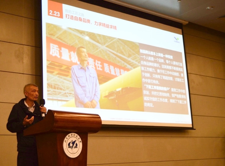 胡双钱师傅用质朴的语言回顾了自己四十五年追梦蓝天的“工匠”轨迹,围绕“什么是工匠精神”、“我的工匠之路”、“工匠精神的传承与创新”三个方面,向北航师生深刻诠释了新时代工匠精神的内涵,展现了老一辈航空人坚守阵地、无私奉献、追求卓越的坚韧品格。胡双钱师傅四十五年的追梦历程也是我国航空工业发展的时代缩影,从上海飞机制造厂技校毕业后,他先后参与了运十飞机、C909客机、C919大型客机项目,见证国产大飞机的发展历程。凭借用心做事、细心习惯,胡双钱师傅几十年来苦干、实干、巧干,加工的几十万零件,无一次品。他勉励学生们要打造自身品牌,力求精益求精,不断提高实际工作能力,提升思考问题的技能。他指出,在追求“短、平、快”的当今社会中,工匠精神就是安下心来,精益求精,去追求卓越的创造精神、精益求精的品质精神、用户至上的服务精神。讲座最后,胡双钱师傅强调,时代需要工匠精神,在平凡普通的工作中也需要工匠精神,无论从事什么职业都要干出彩,干到极致,干到无可挑剔。