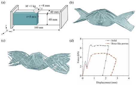 图1 两端固支的三维梁结构耐撞性优化。(a)载荷与边界条件,(b)实心结构,(c)类骨多孔结构,(d)力—位移曲线。