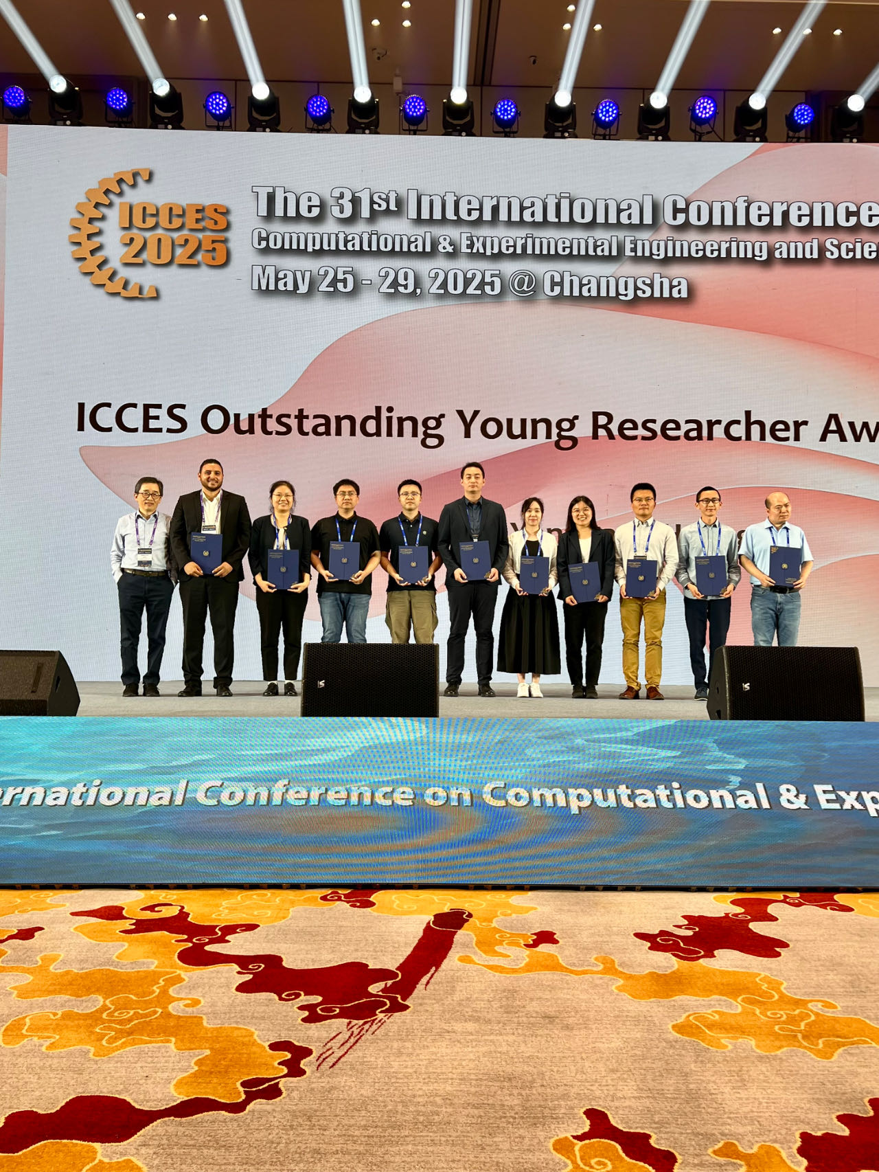 2025年5月25日至29日,第三十一届国际计算与实验科学工程大会(ICCES)在湖南长沙隆重举行。会上,我院丁彬副教授凭借其在微纳米力学与能源材料力学领域的突出贡献,被授予“ICCES Outstanding Young Researcher Award”(ICCES杰出青年学者奖)。