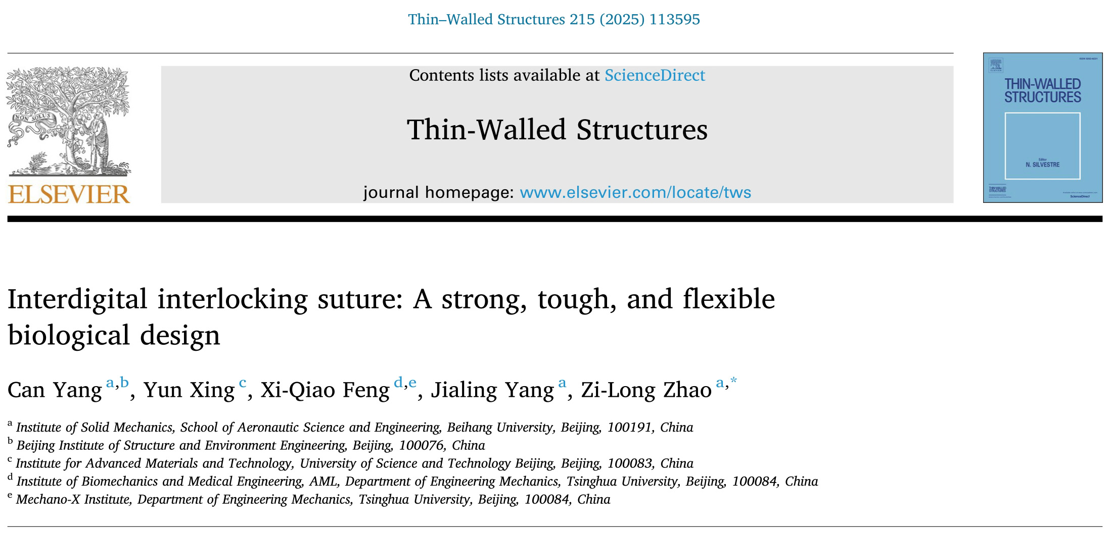近日,我院赵子龙教授、杨嘉陵教授及其合作者在工程技术顶级期刊《Thin-Walled Structures》发表论文《Interdigital interlocking suture: A strong, tough, and flexible biological design》。他们以叉指型缝线结构为研究对象,建立了其变形与失效行为的力学分析模型,揭示了此类结构的形貌力学机理。