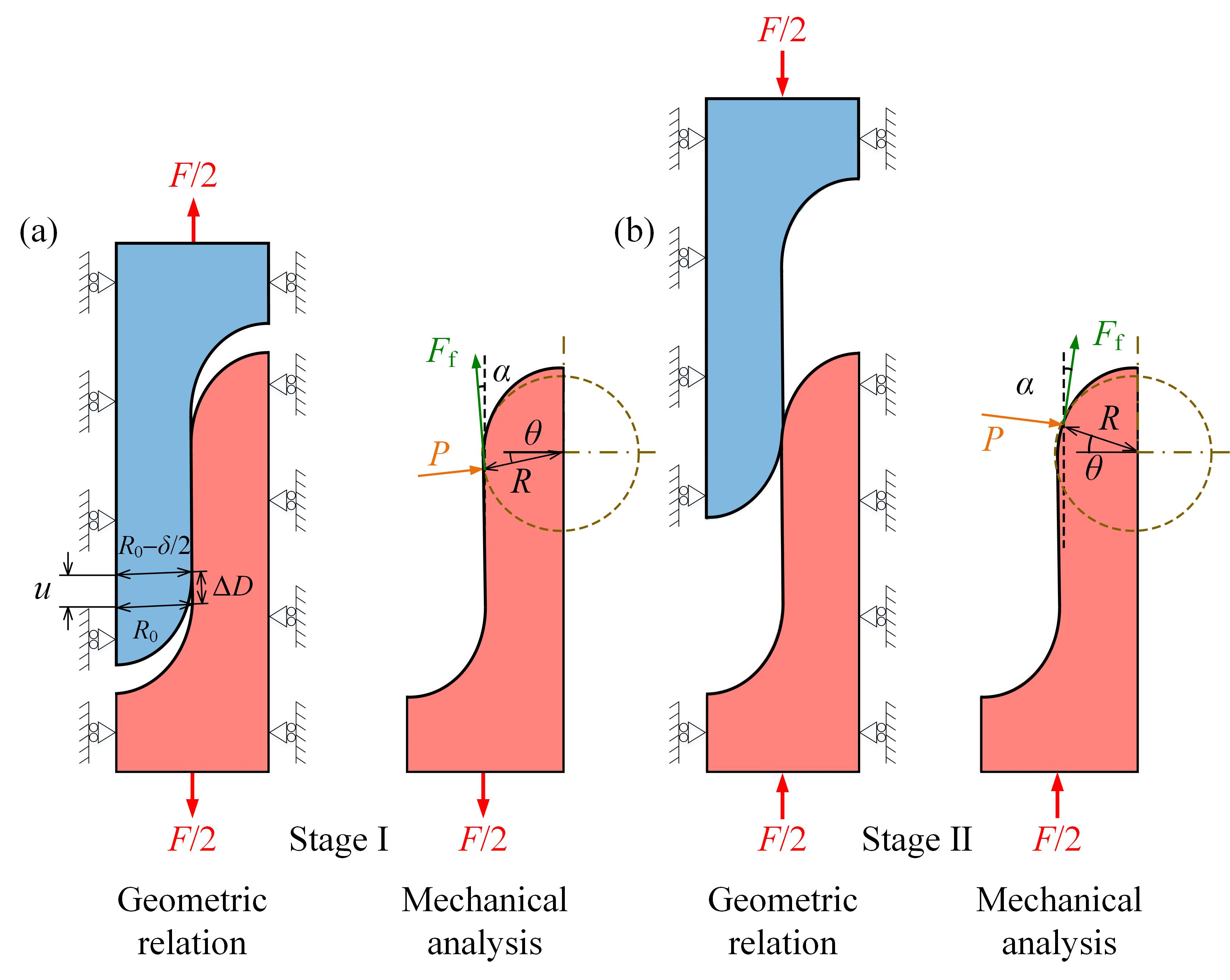 图2 叉指型缝线结构拉拔过程的几何与力学分析。(a)阶段I;(b)阶段II。