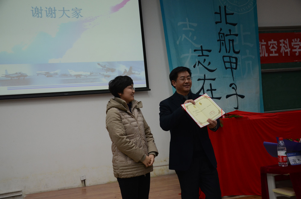 讲座结束后,同学还向张老师献上了鲜花。航空科学与工程学院党委副书记高静老师还为张老师颁发了博雅课堂聘书。讲座在同学们热烈的掌声中结束。